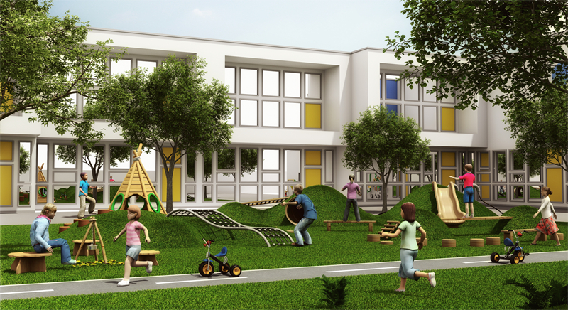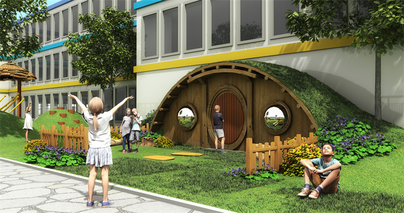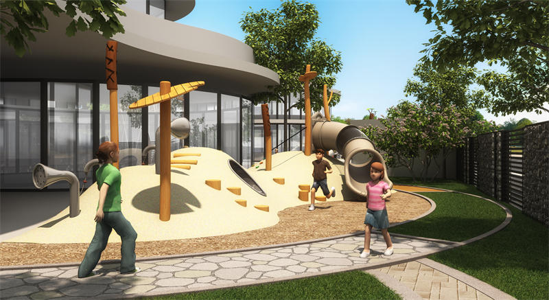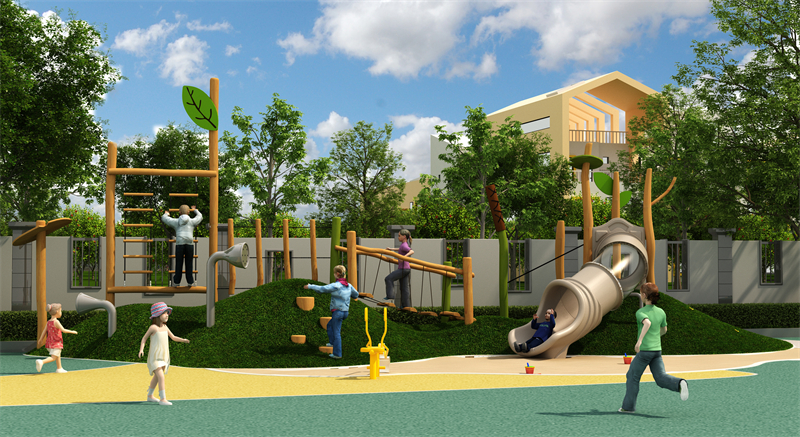 同時(shí),坡面上和坡體內(nèi)設(shè)置不同類型、不同難度的運(yùn)動(dòng)器械:攀爬繩、爬網(wǎng)、攀爬環(huán)、攀爬木樁、攀爬球、鉆洞、以及各種吊橋,讓幼兒在游戲中和周圍的自然環(huán)境親密接觸。